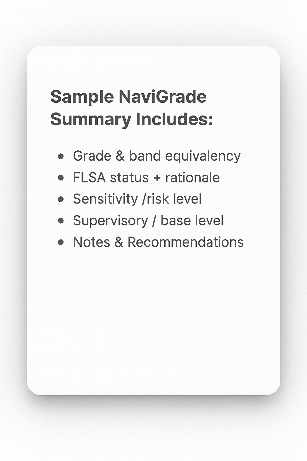 NaviGrade blends expert-built logic with fast AI analysis — evaluating duties, factor levels, and functional complexity instantly, while following OPM structure, FES/GSSG rules, and defensible HR guidance.